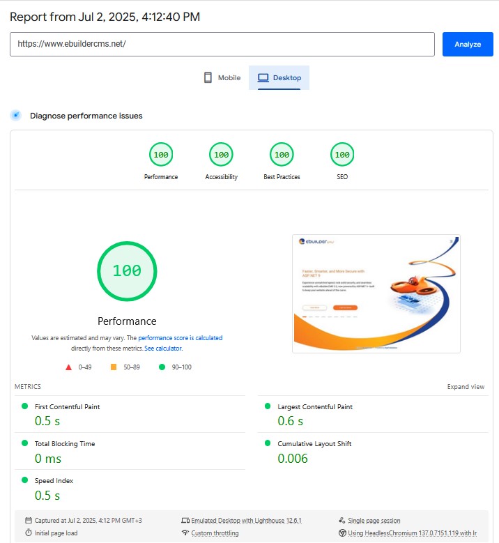 Result of page speed audits of eBuilderCMS website captured after deployed to version 3.3.43